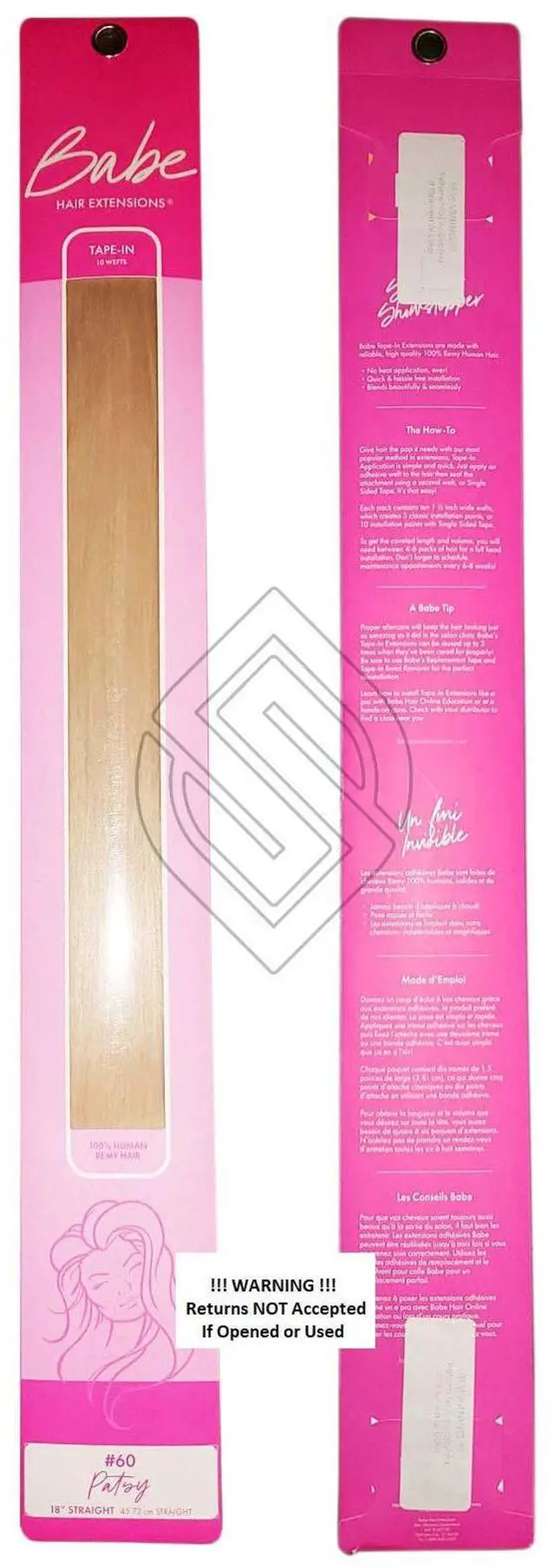 Babe Tape-In 18 Inch #60 (Patsy) Hair Extensions Straight Color 10 Wefts Ounce Gram This revolutionary method is astonishingly fast and the look is shamelessly seamless. It takes as little as 45 minutes to look fabulous. The medical-grade adhesive is designed for hair, so with proper care, the tape wont weaken until youre ready to remove it with the help of our trusty Tape-In Bond Remover. Maybe reused up to 3 times. Lasts 3 to 6 months with proper care.
