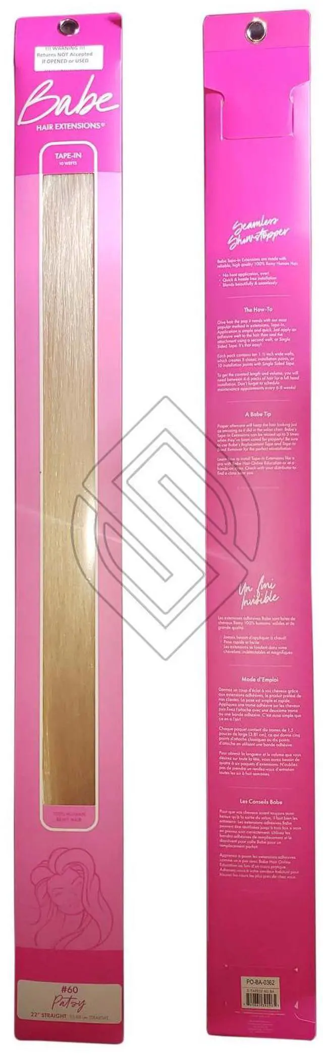 Babe Tape-In 22 Inch #60 (Patsy) Hair Extensions Straight Color 10 Wefts Ounce Gram This revolutionary method is astonishingly fast and the look is shamelessly seamless. It takes as little as 45 minutes to look fabulous. The medical-grade adhesive is designed for hair, so with proper care, tape wont weaken until youre ready to remove it with the help of our trusty Tape-In Bond Remover. Maybe reused up to 3 times. Lasts 3 to 6 months with proper care. Available in 14 inches straight, 18 inches straight, and 22 inches straight.