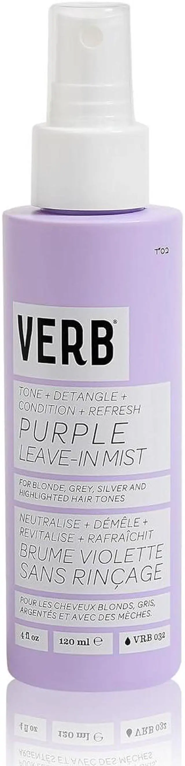 Verb® Purple Leave-in Mist is a three-in-one mist for toning, detangling and hydration. Formulated with pro-grade violet pigment, açai extract and apple cider vinegar, this mist was designed to neutralize brassy yellow hues, refresh hair and condition ends between washes.
