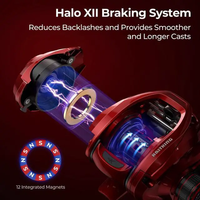 Halo XII 360 degree magnetic braking utilizes 12 individual magnets in a perfect 360 degree circle to reduce backlashes and increase casting distance.