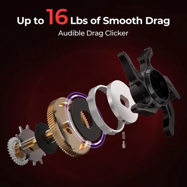 The carbon fiber drag provides up to 16 lbs of smooth, fish stopping power and is easily adjustable with an audible clicker.