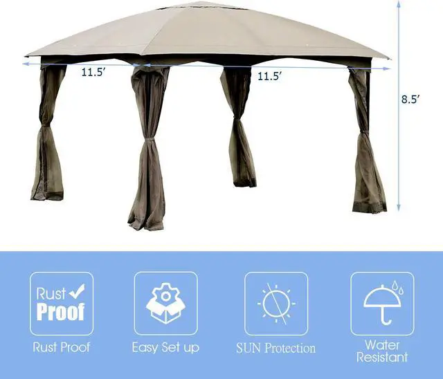 The powder-coated, rust-resistant steel frame and water-proof, fade-proof with UV-resistant 160GSM coated polyester fabric cover is built to last while protecting you from sun and inclement weather for years to come. Built with sloping dome design help ensure proper water drainage. The loop straps allows you to conveniently fix the curtains onto the frame of your structure. With 11.5 ft length and 11.5 ft width our gazebo tent is roomy enough for your party and relaxing in solace to entertaining guests. High quality mosquito netting with zippers, fully enclosed keep you from disturbing of mosquito and other insect. Ideal for daily or recreational use, such as parties, outdoor events, camping, picnics and any other occasion.