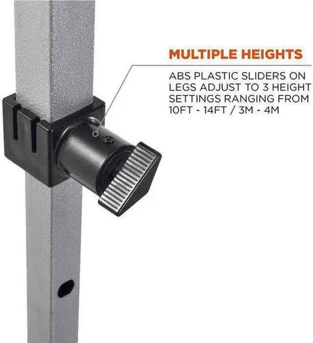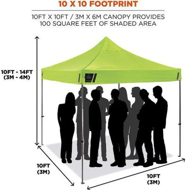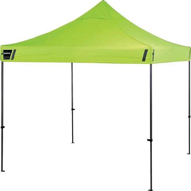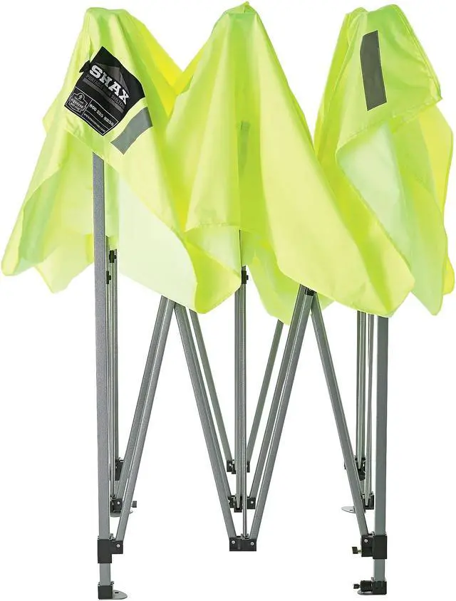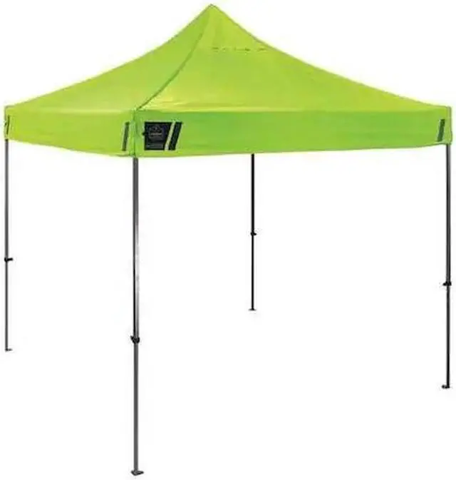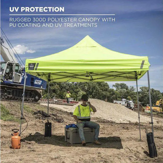 Ergodyne SHAX Lime heavy-duty commercial pop-up tent features PU, UV treated rugged 300D polyester shell for durability and has ABS plastic sliders for height adjustment. 14' Tent comes with reflective accent for good visibility.