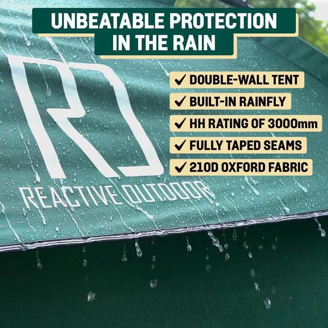 Waterproof with HH rating of 3000mm. 3 Second Tent is fully sealed & protected with taped seams. This keeps the water from getting into the tent, keeping you dry overnight during heavy rains.