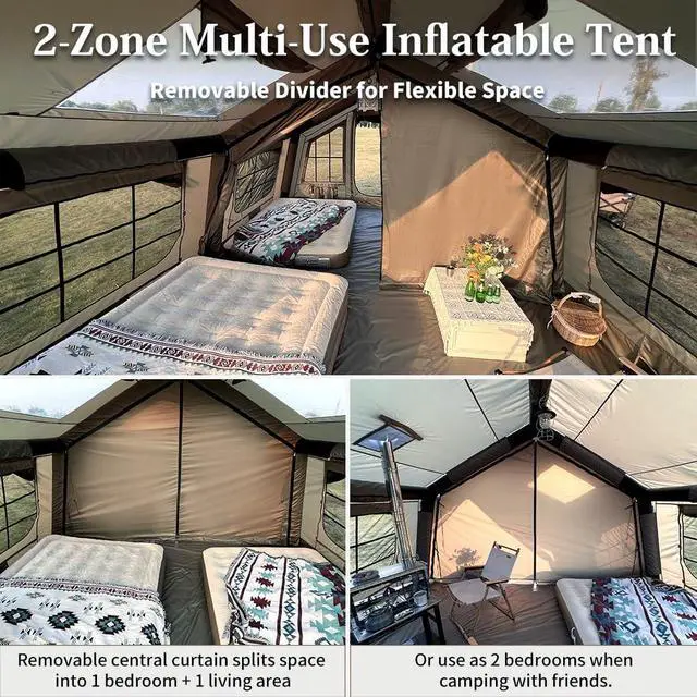 Large Inflatable Camping Tent: The inflatable tent for camping measures 12.99 x 9.58 x 6.4 ft, offering generous space for 6-8 person. Built-in pressure relief valve automatically releases excess air to prevent over-inflation, ensuring a safer camping experience