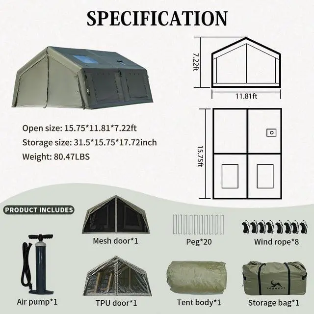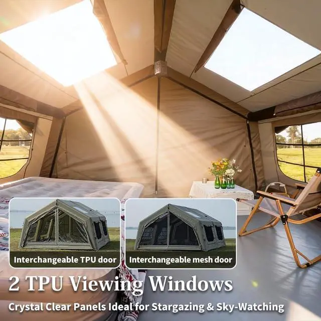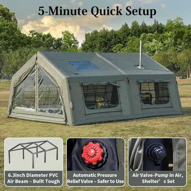 Quick & Easy Setup: This glamping air tent comes with an air pump, allowing you to fully set it up in just 5 minutes. Whether you're a seasoned camper or a first-timer, you'll spend less time setting up and more time enjoying the outdoors