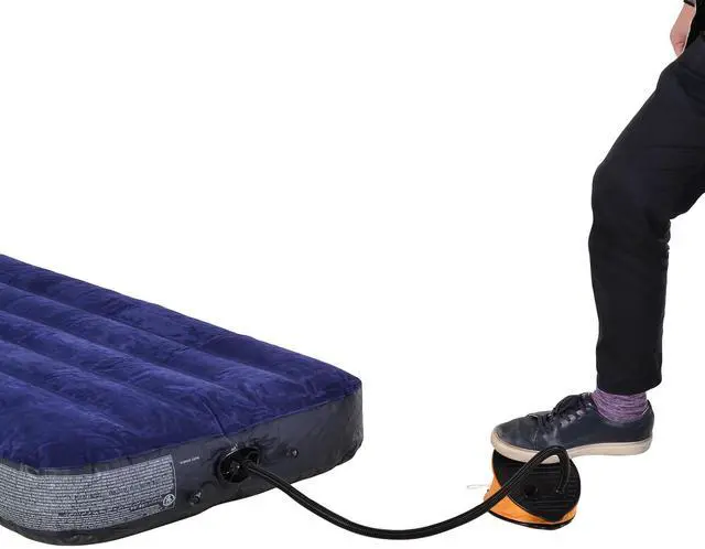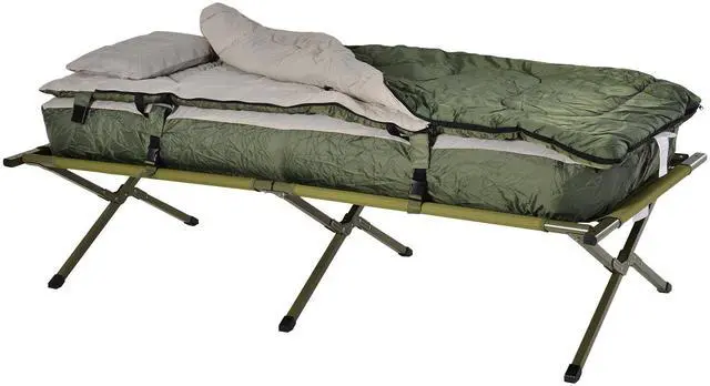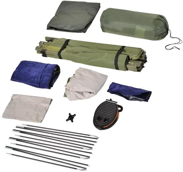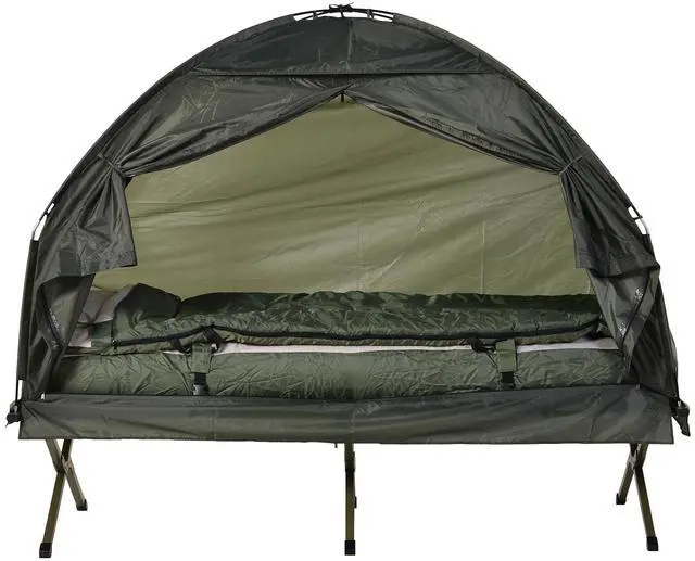 - Includes: Tent, Cot, Air Mattress, Sleeping Bag, Pillow, Foot Pump, Carrying Bag