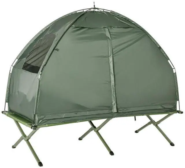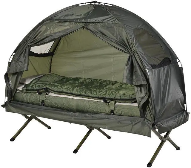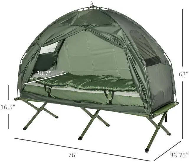 Get a comfortable night’s sleep and wake up re-energized for adventure with the all-in-one camping tent and cot combo from Outsunny. Everything you need for camping is here with a tent, sleeping cot, air mattress, and sleeping bag all in one (sheets and a pillow are included too!). Stay warm and cozy by sleeping on an elevated platform that keeps you off the cold, hard ground. Set up is simple, so you spend more time having fun and less time getting ready. When you’re finished with your trip, the included travel bag lets you store everything away until your next adventure. ; NOTE: This tent is meant for use in sunny, fair weather. For use in rain use a ground cover and rainfly as this tent is not fully waterproof and cannot repel heavy rain. Do not use this tent in strong wind, hail, or snow.