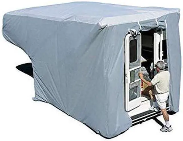 Truck Camper 213"L x 104"W x 104"H Ideal for climates with intense moisture and moderate sunshine Triple layer SFS AquaShed top panel beads water on contact High performance Polypropylene side panels Rear Zipper Entry Doors Completely Breathable with moderate U.V. stability Strap and buckle attachments prevent billowing Elasticized corners Front and rear cinching system for loose fabric Ladder Cap reduces wear over ladder area Storage Bag included Fit's Truck Campers up to 104" wide and 104" tall. Ideal for climates with intense moisture and moderate sunshine. Protect your investment and provide triple the protection compared to standard covers. High performance polypropylene sides insure maximum breathability and virtually eliminate mold and mildew. Triple layer SFS AquaShed top panel beads water on contact affording maximum resistance to high humidity and rainfall in addition to protection against UV rays. Contoured to fit Truck Campers. Rear Zipper Entry Doors for access during storage. Strap and buckle attachments prevent billowing in windy locations and allow for a custom look. Elasticized corners resist tears and snags. Front and rear cinching system for loose fabric. Includes storage bag for easy stowing of cover when not in use. Polypropylene ladder cap reinforces rear panel reducing cover wear over ladder. For a proper fit, measure floor length front to back. Fit's Truck Campers up to 104" wide and 104" tall.