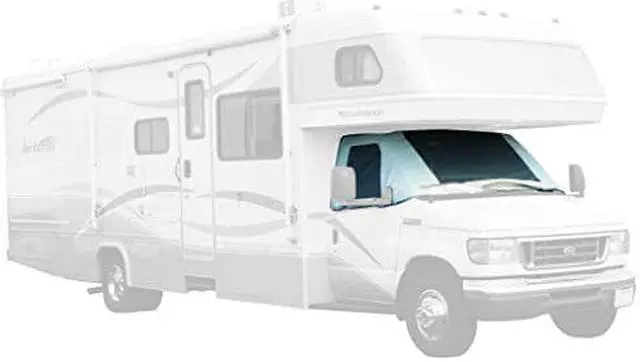 See thru windshield cover Class C and B White vinyl See-thru Windshield cover provides privacy, protects dash and has the added feature of roll-down panels. With panels rolled down you have a panoramic view without removing the cover. Panels are held in place with Velcro when you need the privacy. Ford 1996-2010 mirror cut-out
