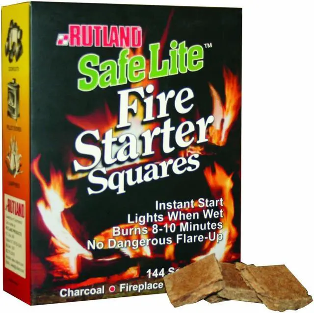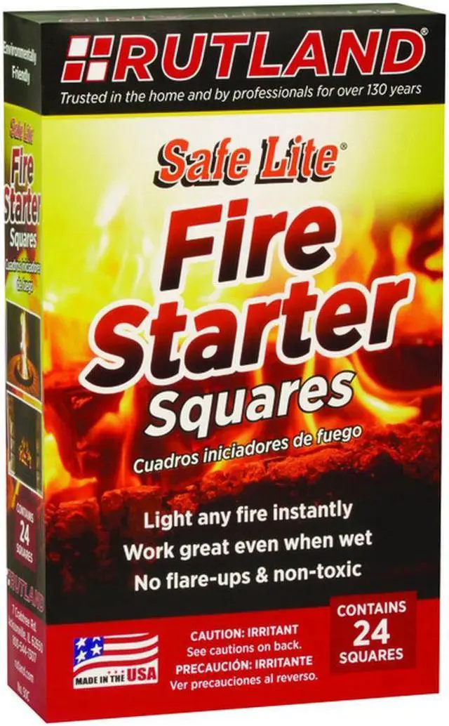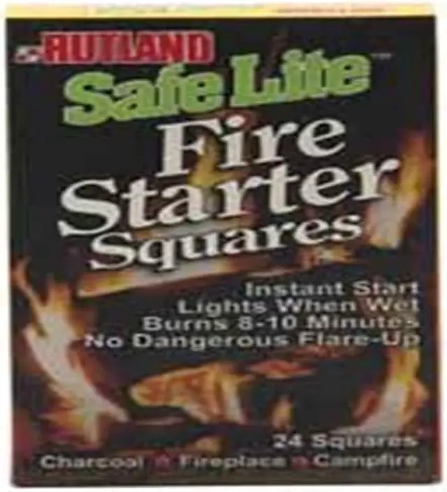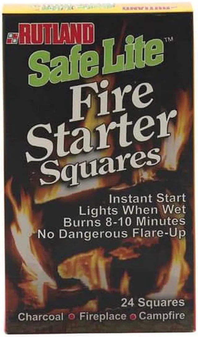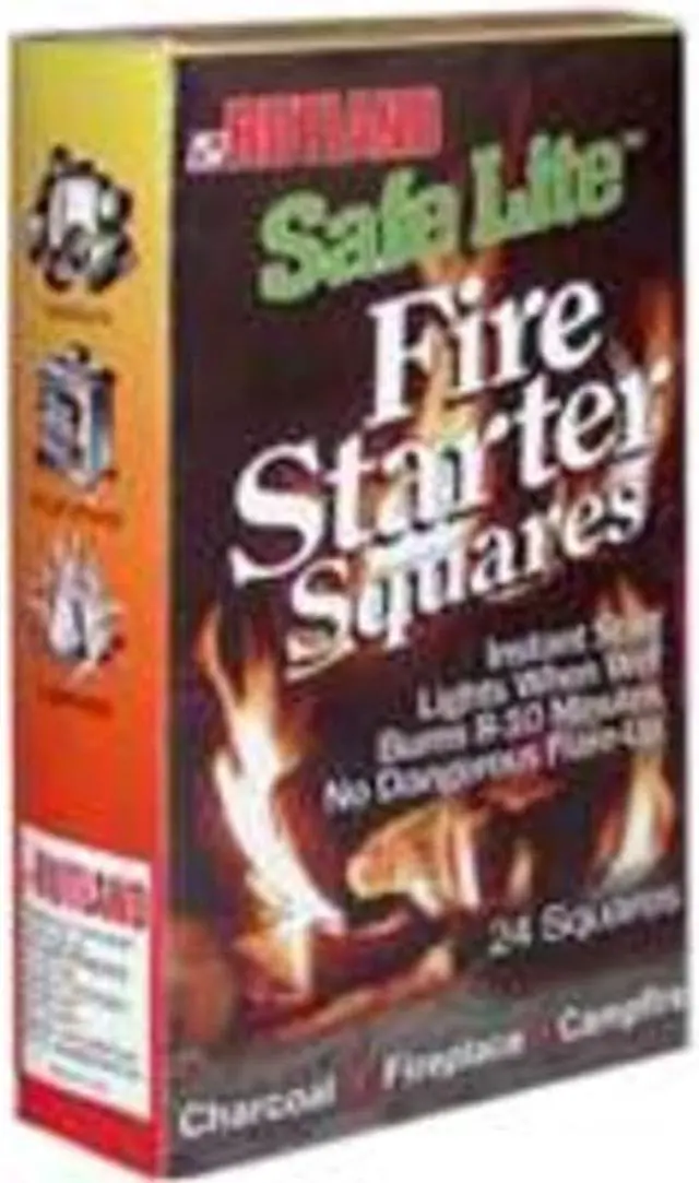 Fire Starter Squares, 24 squares. Instant start, lights when wet, burns 8 to 10 minutes. No dangerous flare-up. Use in fireplace, campfire or to start charcoal.
