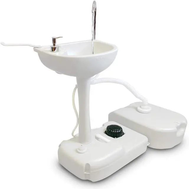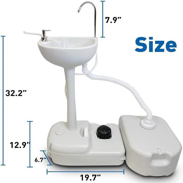 The SereneLife SLCASN19 Portable Handwash Sink is a convenient and practical solution for washing hands at outdoor events, campsites, workstations, or wherever clean water is needed. This compact handwash station comes with a 24-liter waste holding tank, a liquid soap dispenser, and a foot-pump water dispenser for hands-free use. The rolling wheels and built-in carry handle make it easy to transport, even when the sink is filled with water. The high-density polyethylene construction ensures durability, while the 2.7 ft. drainage hose helps to quickly dispose of wastewater. The sink is easy to assemble, and the towel holder adds extra convenience for use during social events, worksites, or camping.