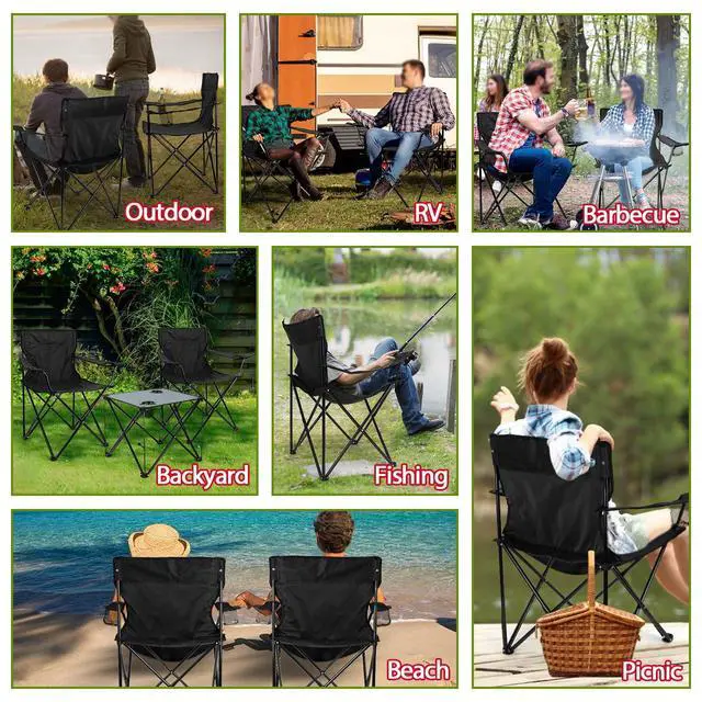 Contains: 2 camping chairs, 1 folding table, 3 storage bags.