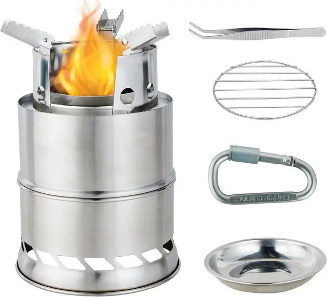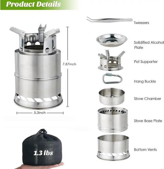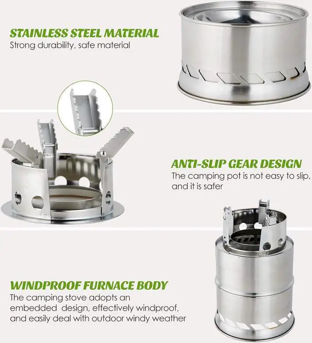 Safe: The camping stove is made of sturdy stainless steel, which can be used for a long time, even under heavy loads or high temperatures. The top of the portable wood stove stand is designed with anti-slip gears, making the camping pot safer to put on and less prone to slipping.