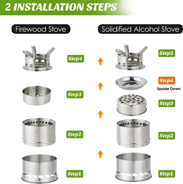 Free Natural Fuels: All-natural combustible materials are available anytime, anywhere, such as twigs, firewood, dried husks, charcoal, dried animal waste, etc. Easy to use, safe and environmentally friendly. You don' t need to spend extra money to buy fuel and enjoy real outdoor camping fun. And the solid alcohol stove also includes a plate where solid alcohol fuel can be placed.