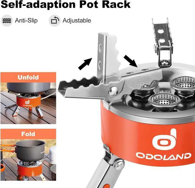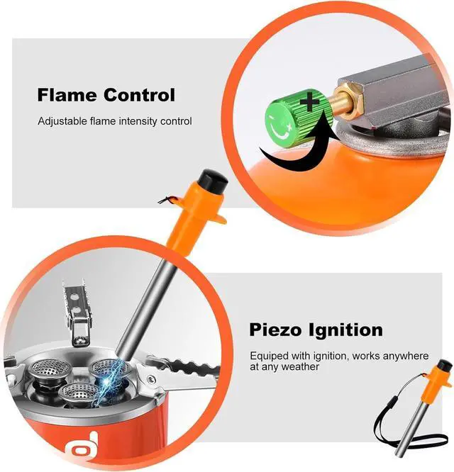 Flame Control and Steady Support - The flame adjustment knob helps you adjust the flame size according to your needs. Automatically adapt to the arc of the bottom of the backpacking pot, and the serrated tray can easily fix a variety of pots and utensils. Without fear of your cooking pot falling over.