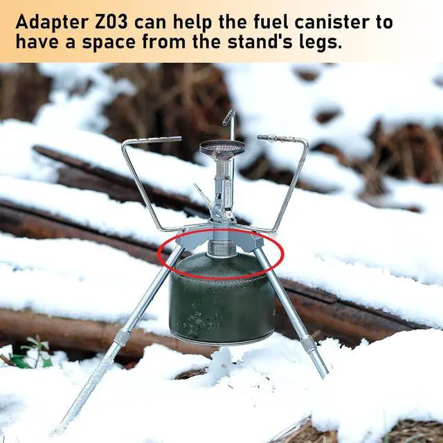 A stand for outdoor screw on type gas fuel canister and backpacking/camping devices. The large upper support (trivet part) provides firm support for big pot, and it is stable even on rough terrain such as mountain climbing and rocky areas.