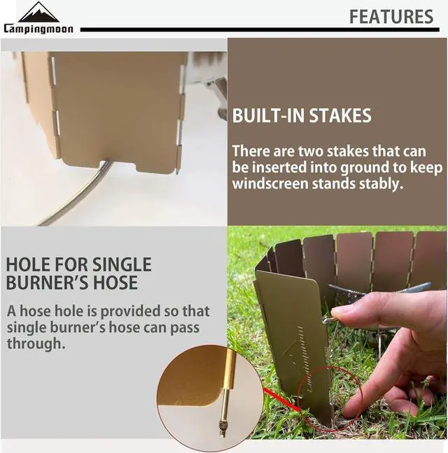 BUILT-IN STAKESThere are two stakes on this stove windscreen that can be inserted into ground to keep windscreen stands stably.