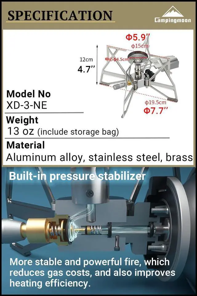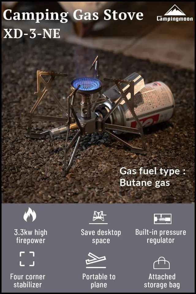 This CAMPINGMOON backpacking butane camping gas stove XD-3-NE is lightweight & foldable & compact. You can fold this butane stove into attached storage bag.