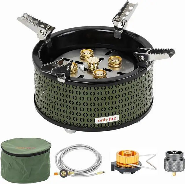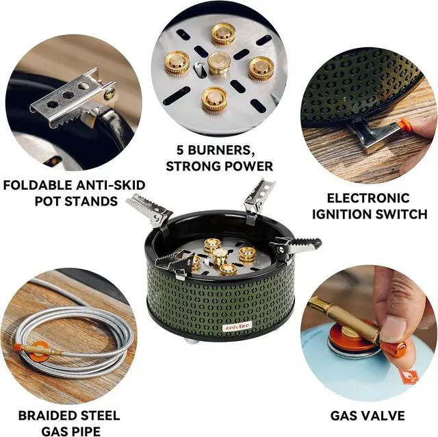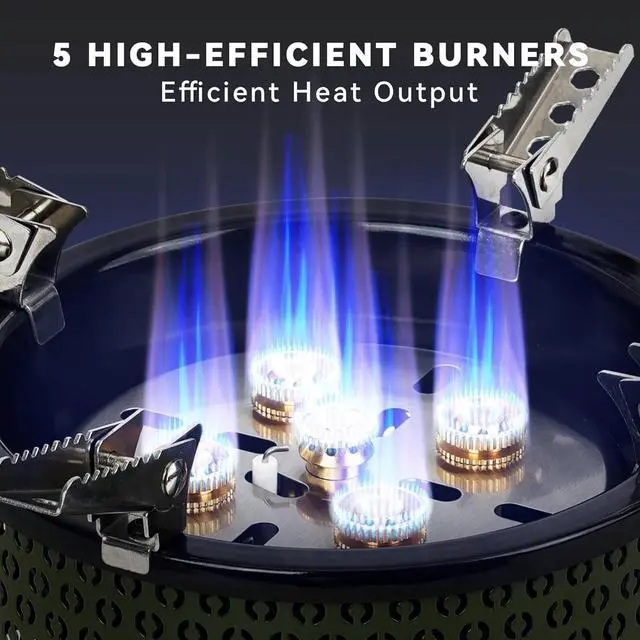 5 BURNERS CAMP STOVE WITH 18600W POWER With an impressive heat output, the onlyfire camping stove ensures swift water boiling and food preparation. You can enjoy a nice cup of coffee easily outdoors. You can achieve the perfect temperature for your culinary creations with the precise flame control.