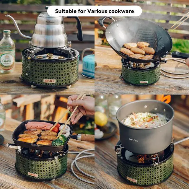 FOLDABLE & STURDY BRACKETS FOR VARIOUS COOKWARES This camp stove is designed with foldable brackets to accommodate various cookware, including coffee pots, kettles, or frying pans, making it an essential companion for your outdoor adventures. You can whip up a variety of meals during your outdoor adventures. Perfect for patio use, camping trips, hiking excursions, and RV adventures.