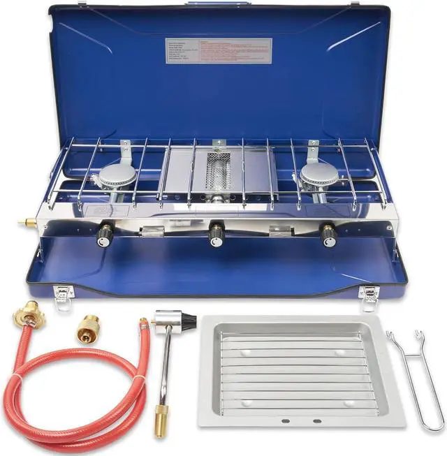 3 BURNERS| Two stainless steel flame stoves and 1 grill stove for your different needs.