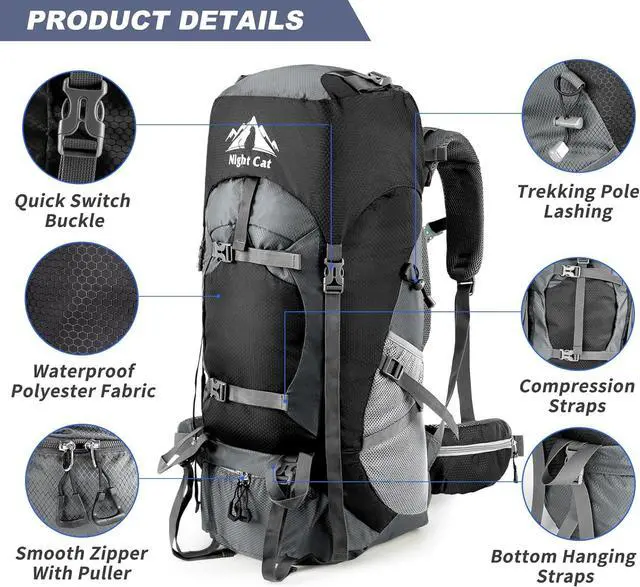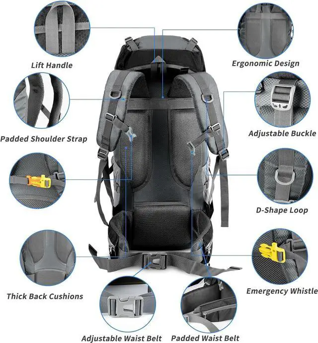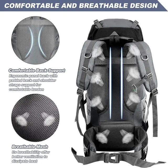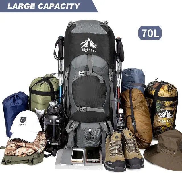 70L Large Capacity & Multi CompartmentThis lightweight hiking backpack only weights 1kg. The Size of backpack is 33X27X73cm and the loading capacity up to 70L. With multiple storage compartments and the large main compartment with extra zipped internal pocket, makes your items organized well. Good daypack for a short outdoor trips
