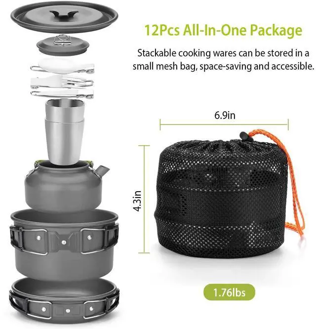12Pcs Outdoor Cooking Set:This package contains one pot(1.9L),one kettle with lid(0.8L),one frying pan(0.86L),one pot lid,one carabiner,one spoon,one fork,one knife,two cups(175ml),and two storage bags. You can find everything you need for outdoor cooking in this package.