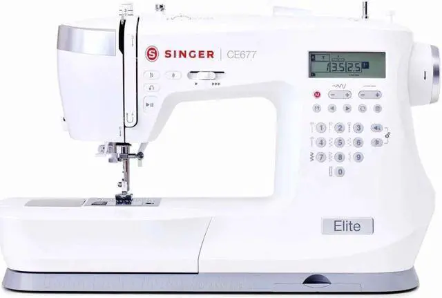 The Singer Elite CE677 Sewing Machine offers computerized, touch-button sewing that's tailored to your needs. With an elegant and remarkably durable design, it delivers greater piercing power, enhanced speed, and versatility. Expand your sewing possibilities with all innovative features built into the sewing machine, from the basic tools youd expect to more intricate functions that are sure to inspire your creative side. Work with a wide range of fabrics and easily tackle any project. You are sure to achieve quality, consistent results thanks to a stronger motor and heavy-duty metal frame.Praiseworthy Stitching at Your FingertipsThe extra-sturdy yet stylish Singer Elite CE677 Computerized Sewing Machine features 411 stitch applications through 200 built-in stitches. To further personalize your projects, it includes lettering and character options as well as seven automatic one-step buttonhole styles, perfectly sized for your button.Simple Controls that Free up your Time and CreativitySelect your settings, and watch them immediately appear on an LCD screen display, so you can see your stitch, stitch settings, and more. Have fun exploring the many creative and traditional stitch applications.Fast, Hassle-Free SewingUsing the Singer Drop and Sew bobbin system couldnt be faster. Rather than manually drawing up the bobbin thread, the machine will pick it up for you. The machines integrated needle threader will also save you time, so you can always count on a quick start. The stitch tie off is extremely handy too, keeping your decorative stitching from unraveling at either end. The programmable needle adjusts the stopping position up or down. Drop feed allows for free-motion quilting, monogramming, button sewing, and more. Six included presser feet open up your projects to even more possibilities. With this computerized sewing machine, you can focus more on your creative approach and keep all your sewing easy and fun.Built-In StitchesChoose from a variety of 200 stitches for basic sewing, decorative sewing, and more.One-Step ButtonholeButtonholes are sewn in one easy step. Just place the button in the buttonhole foot and the machine sews a buttonhole perfectly sized for that button, delivering consistent results every time.Built-In Needle ThreaderKEY_TAB