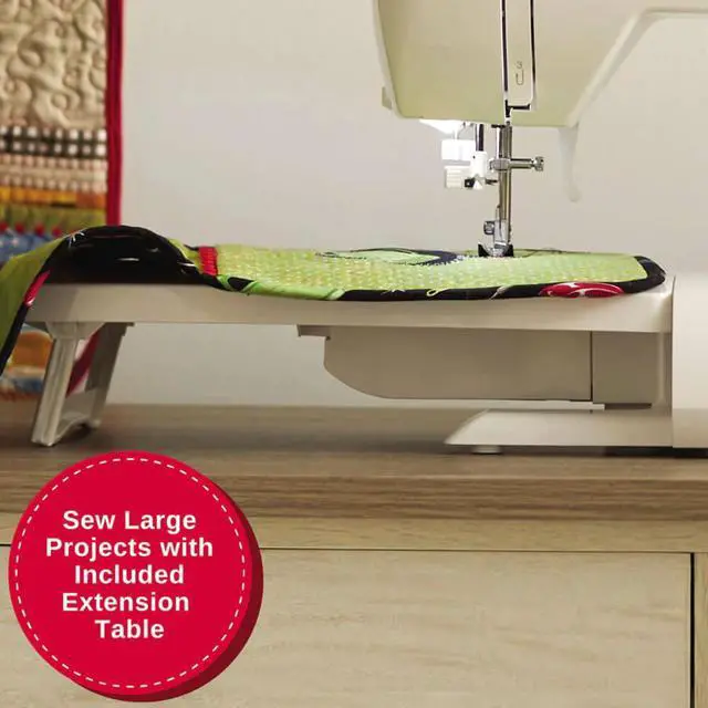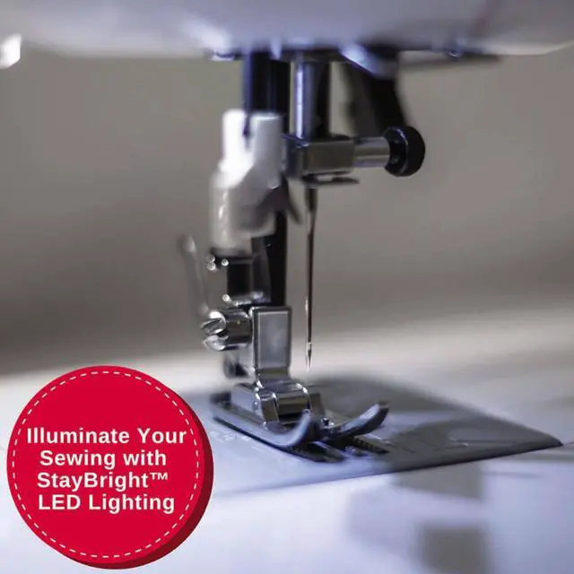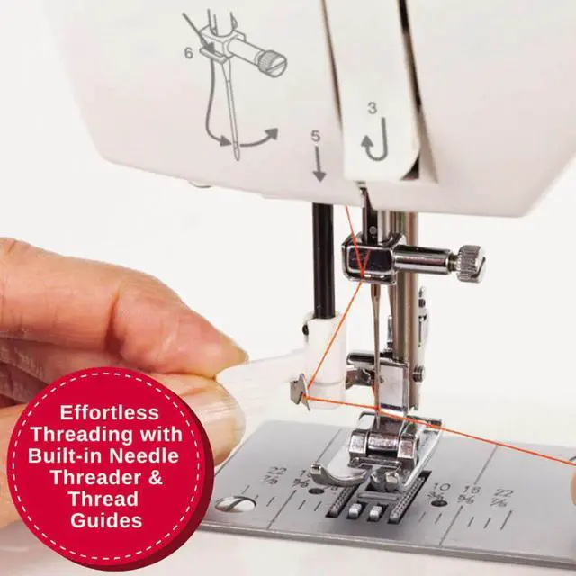 The built-in needle threader helps you thread the needles eye effortlessly, saving you time. The heavy duty metal frame helps ensure long lasting durability. The removable storage compartment easily slides off the machine, giving access to the free arm for sewing cuffs, sleeves and other smaller projects.