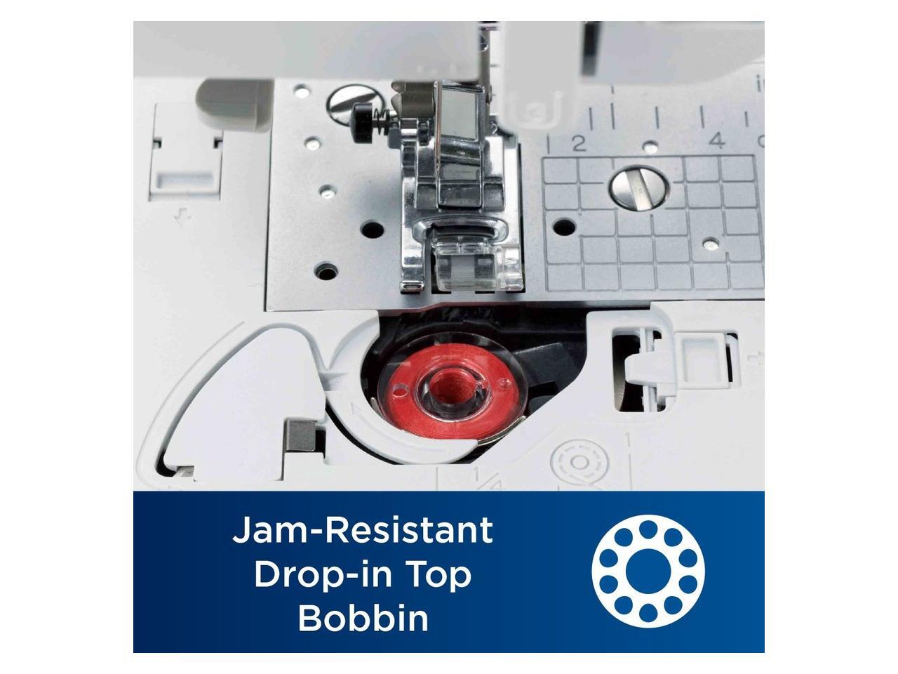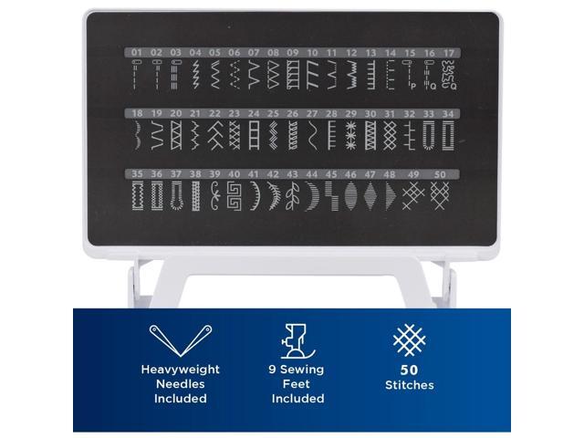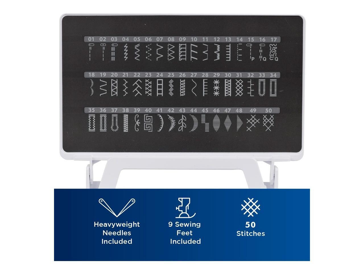 - 50 built-in sewing stitches, including decorative stitches and 5 styles of one-step, auto-sized buttonholes