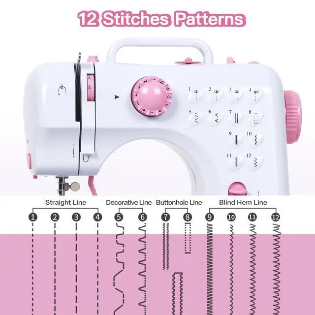 1-4 for sewing straight lines, 5 and 6 for sewing lace, 7 and 8 use together for sewing buttonholes, 9 and 10 for locking edges, and 11?12 for wrapping edges. And it is better to use the different stitch together with the matching presser foot