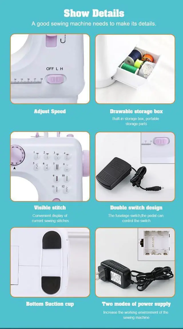 [Sewing machine dual power and dual switch] Our sewing machine can be controlled by foot switch and button switch, whether you are a beginner or a sewing enthusiast, you can easily operate it, AC adapter and 4 AA batteries two power modes, battery mode is suitable for you to use when going out, remember not to use two power modes at the same time, otherwise the motor will be damaged.