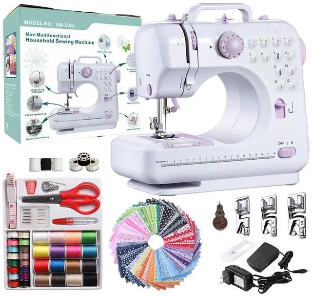 Sewing Machine for Beginners with 50 Pcs Fabric and 32 Pcs Sewing Threads Kit, Small Portable Mini Sewing Machine 12 Built-in Stitches 2 Speed with Foot Pedal