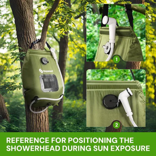 Solar Heated Shower BagMade from durable materials, this portable shower is great for outdoor use. It heats water to 113°F (45°C) in just 3 hours using sunlight, so you can enjoy a warm shower without electricity. The temperature indicator lets you know when it's ready, making this portable shower for camping a great choice. Its a reliable portable camping shower for all your outdoor adventures.