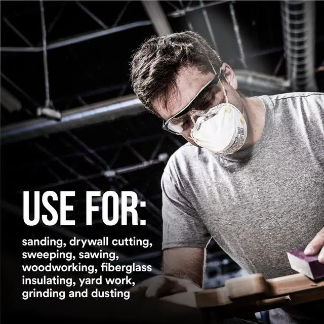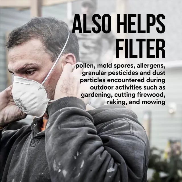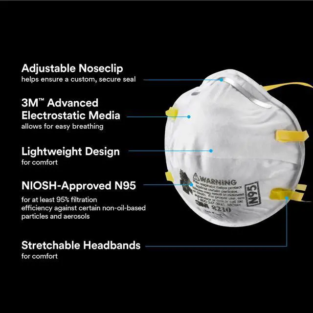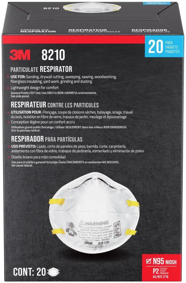 The 3M Particulate Respirator 8210 provides at least 95 percent filtration efficiency against certain non-oil-based particles and aerosols. The 3M Advanced Electrostatic Media allows for increased air flow while enhancing the capture of airborne particles helping you breathe easy. Cushioning nose foam, adjustable noseclip and stretchable headbands help provide a comfortable, secure seal. This N95 respirator helps filter pollen, spores, allergens, and dust particles. This disposable respirator may be suitable for activities such as sanding, drywall cutting, sweeping, sawing, wood working, fiberglass insulating, yard work, grinding and dusting. Country of Origin: United States.