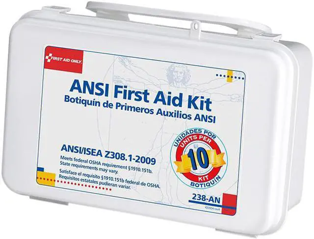 This 64-piece, 10-unit ANSI-compliant first aid kit holds all 10 ANSI-required items in a plastic case. Sturdy handle allows convenient transportation. Smooth exterior wipes down easily to maintain sanitary use. Wall-mountable design provides comfortable access to items. Kit includes adhesive plastic bandages, gauze dressing pads, trauma pad, triangular sling/bandage with safety pins, BZK antiseptic towelettes, burn cream packs, tape roll, antibiotic ointment packs, exam-quality vinyl gloves and first aid guide.