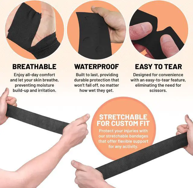 These cohesive bandages are soft enough to protect your wounds without damaging your skin. They dont chafe or irritate your wounds, but are breathable enough so that they can heal properly. Our bandage tape has a self adherent stick that lasts through rain or shine. What that means to you is a lot less money spent on bandages. What that really means to you is more money spent on important things, and that ultimately means no more messy, wet, gross bandages falling off.