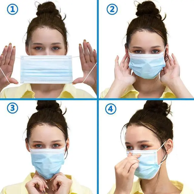 INSTRUCTIONS: 1. Clean your hands with soap and water before touching the mask. 2. Hold the mask with the stiff bendable strip on top, and the colored side facing outwards. 3. Hold the mask by the ear loops, and place a loop around each ear. 4. Pinch the nose strip to conform to the shape of your nose. 5. Pull the bottom of the mask over your mouth and chin.