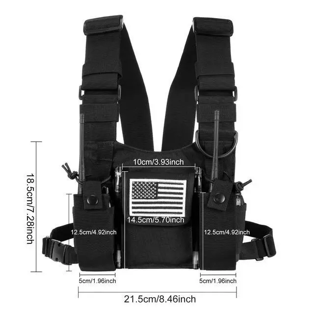 Front radio pockets with strap: You can put 2 walkie talkiesin side and strap will fix radio antenna so that it fits very tightly;