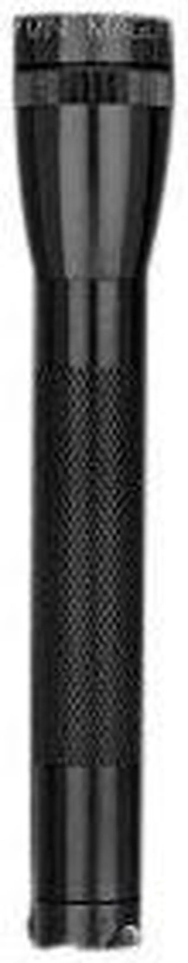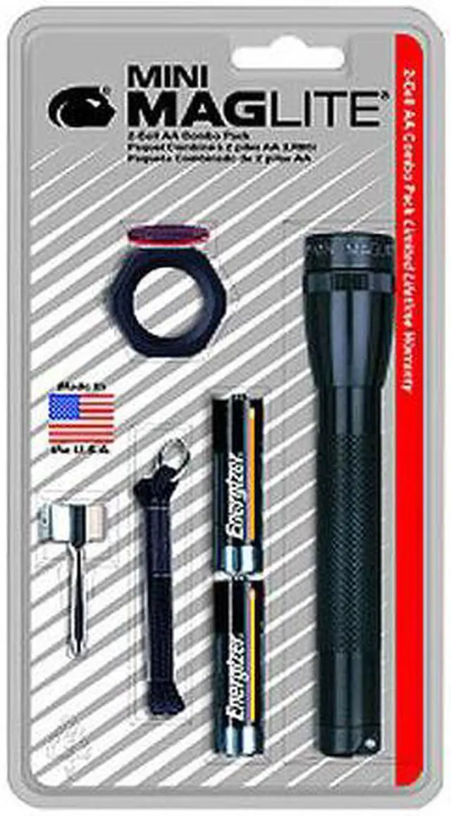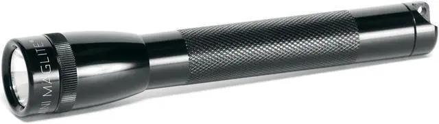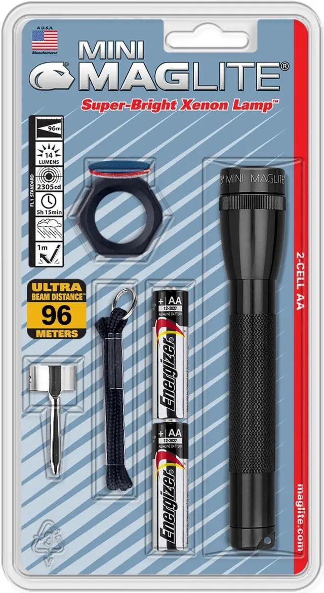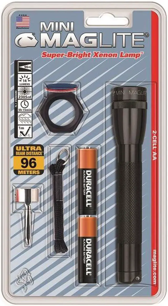 Mini Maglite Flashlight in black color includes incandescent bulb that offers beam distance up to 96 m and has aluminum construction. Flashlight with pocket clip/lanyard wrist strap/lenses/holder requires 2 AA alkaline 3 VDC batteries to operate.