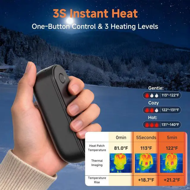 recision and safety are at the core of our hand warmers. With 3 adjustable temperature settings (113°-122°F, 122°-131°F, 131°-140°F), you can customize your warmth to match the weatherwhether you need mild heat for indoor office work or maximum warmth for hunting in freezing temperatures.