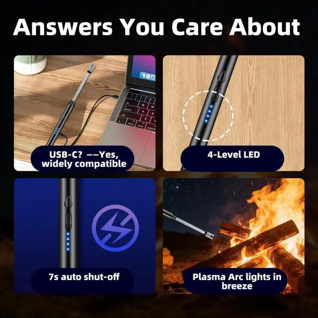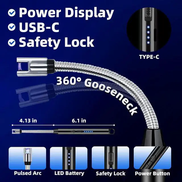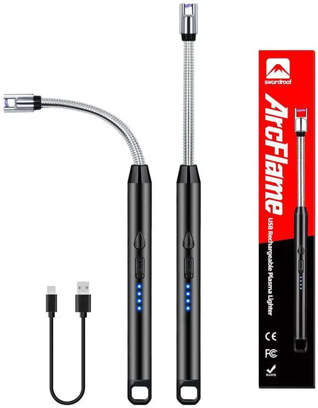 Elevate your lighting experience with our 2-Pack Electric Candle Lightersthe modern, reliable solution for candles, grills, camping, and beyond. Combining advanced USB-C charging, a windproof plasma arc, and a flexible long-reach design, this lighter is built for convenience, safety, and everyday use. Say goodbye to butane refills and messy flames. Simply recharge the lighter using any USB-C cablethe same versatile connector used by most modern devices. The built-in 4-level LED power display lets you monitor the battery status at a glance, so youre never caught off guard with a low charge. Thanks to its flameless plasma arc, this lighter lights candles, stoves, and grills quickly and cleanlyeven in windy conditions. Theres no open flame, no fuel odor, and no soot, making it perfect for indoor use, outdoor adventures, and sensitive environments. The flexible 360° gooseneck neck bends and holds its shape, allowing you to safely reach deep jar candles, fireplace kindling, BBQ grills, or camping stoves without exposing your hands to heat or flame. Its ergonomic, easy to control, and ideal for hard-to-access spots. Your safety is our priority. The lighter features a practical safety lock to prevent accidental activation, along with a 7-second auto shut-off and overheat protection. While designed for adult use, we recommend keeping it out of reach of children. This value-packed set includes two lightersperfect for keeping one in the kitchen and another in your camping or travel bag. Presented in ready-to-gift packaging, it makes a thoughtful stocking stuffer, holiday gift, or practical present for candle lovers, grill masters, and outdoor enthusiasts