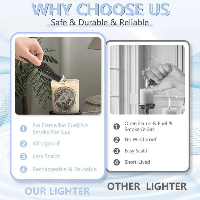 - [WARM REMINDER]- During the ignition process, electric lighters will make a "zee,zee" sound, which is produced by the electric arc during normal operation. Please use it with confidence. When using candle lighters long, please keep your hands dry, away from skin and flammable items to ensure safety. Wipe the arc head and remove flammables timely after use to extend its life. Store candle lighter rechargeable away from open flame, high temperature, and direct sunlight to avoid accidents.