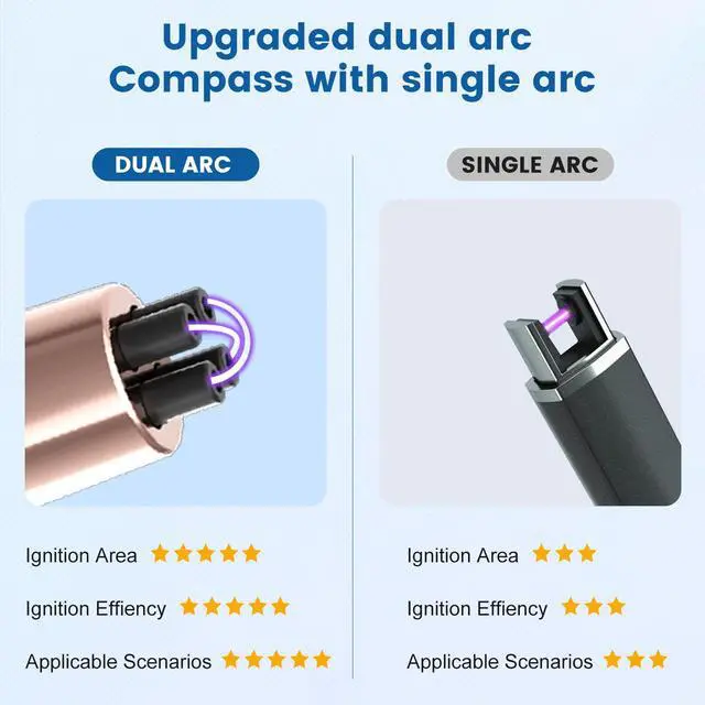 UPGRADED DUAL ELECTRIC ARC with revealed ignition contacts, which would increase ignition area and speed.The ignition speed is 3 times faster than the single rechargeable lighter, and also provides more application scenarios.