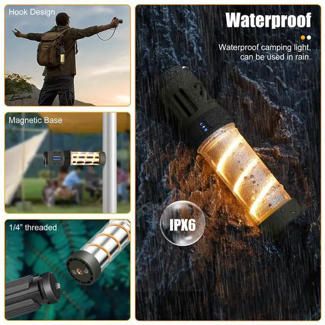 - Reliable Outdoor Camping Light--- This multifunctional camping light is IPX6 waterproof and uses military-grade materials for a compact structure design. It is a reliable gear and a perfect gift for campers, anglers, hunters, boaters, and outdoor enthusiasts.