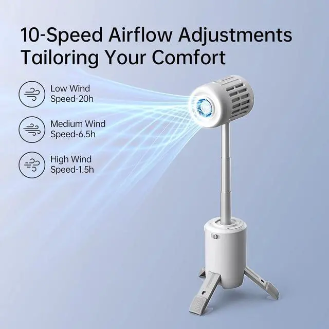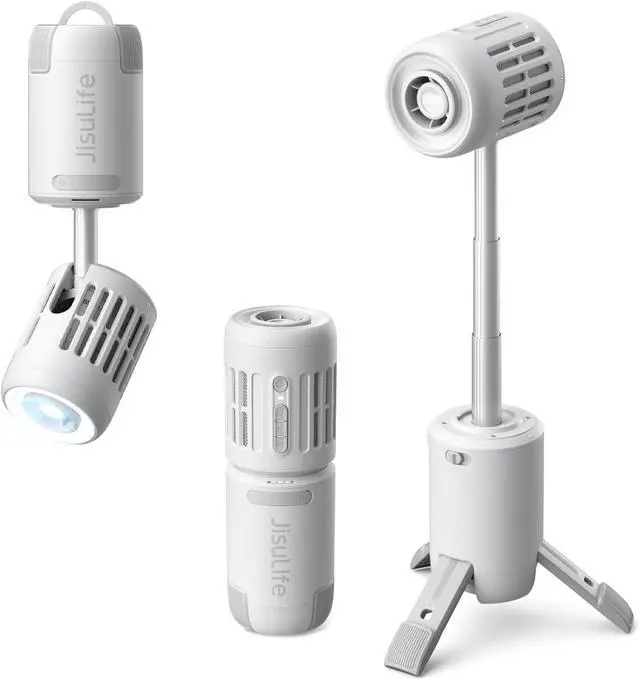 Four Transformations to Meet Various Scenarios: An integrated handheld fan, table fan, standing fan and camping ceiling fan. You can better hang the ceiling fan on tents, cars, branches,and walls with built-in foldable loop. Thanks to the combination of retractable aluminum pole and hidden tripod, it can be placed stablely on outdoor ground and desk. The cylindrical body design also makes it easier to hold when used as a hand fan