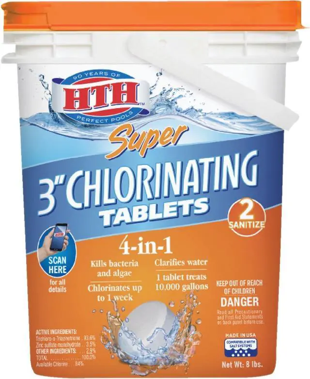 When used as directed, this product is an effective swimming pool water sanitizer. These convenient and easy to use tablets are formulated to protect against chlorine loss in direct sunlight, and can be used in skimmer, floater or feeder. Chlorinates for up to 1 week. 4-in-1 formula kills bacteria and algae. 1 tablet treats 10, 000 gallons of pool water.