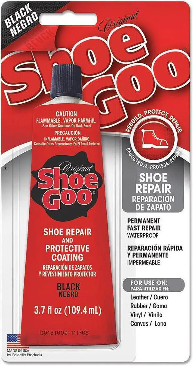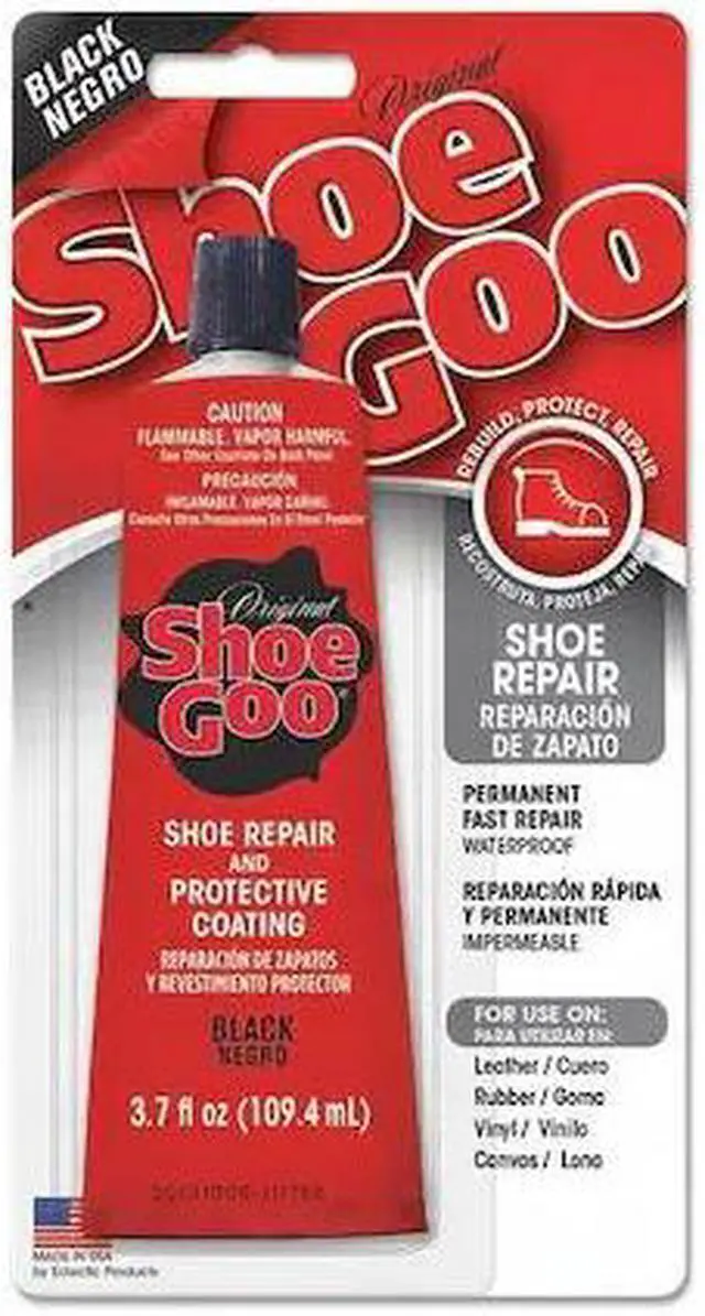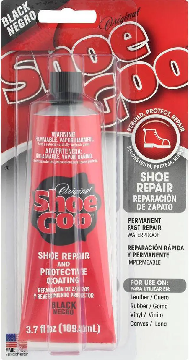110212 ECLECTIC SHOE GOO ADHESIVE 3 7OZ BLACKEclectic Adhesive Shoe Goo 3 7oz Black- The unique formula is designed for strong abrasion resistance and better adhesion to flexible materials Bonds protects and rebuilds for a permanent repair Excellent sealant perfect for patching small holes Ide