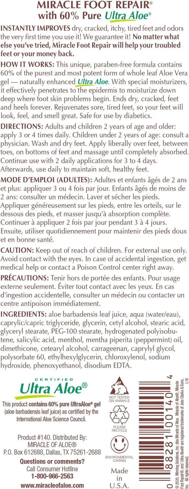 Miracle of Aloe's Foot Repair Cream will restore and revitalize your aching, dry and calloused feet so you can live life to the fullest.
